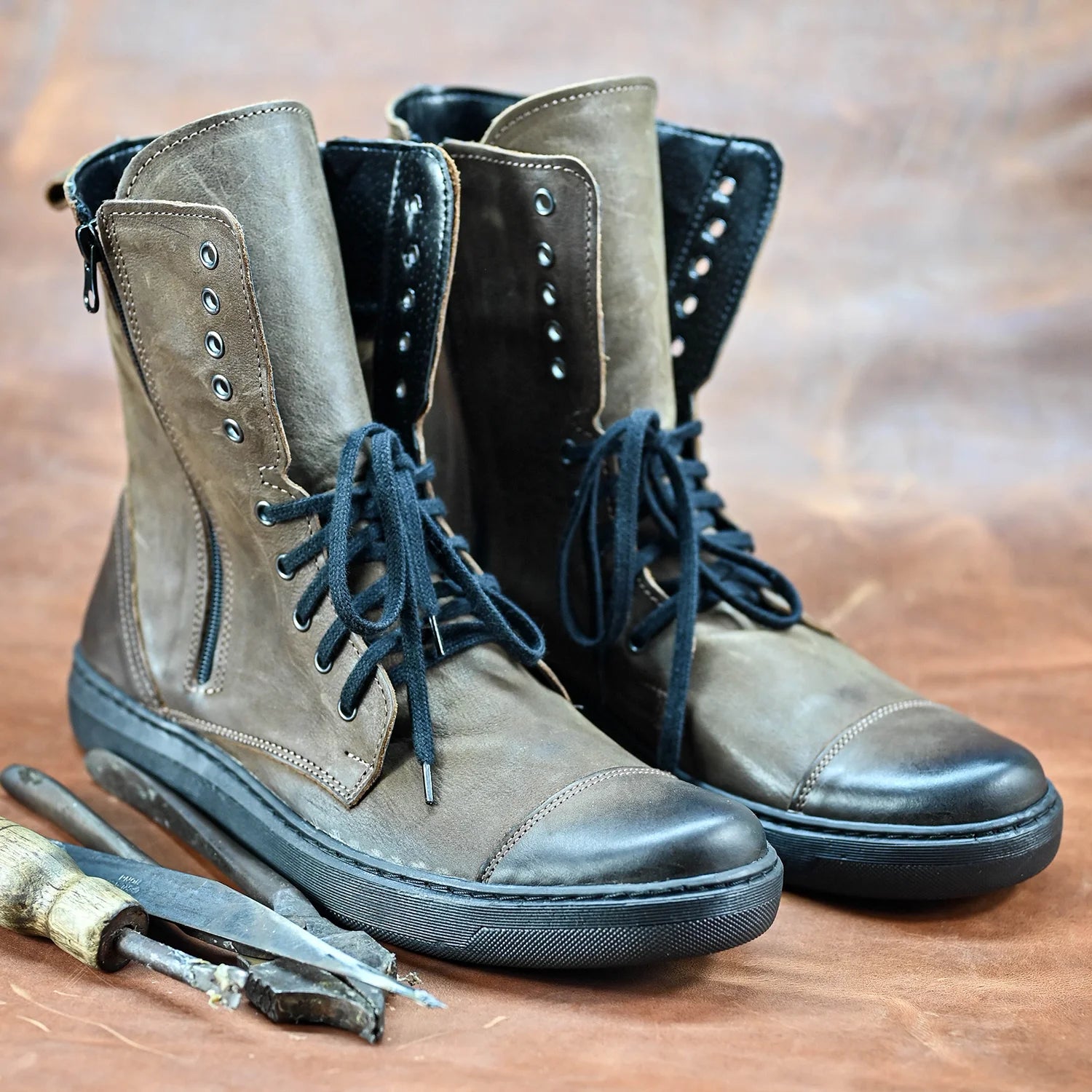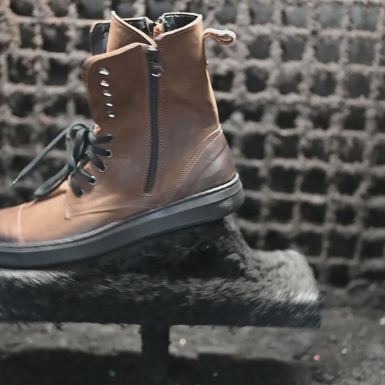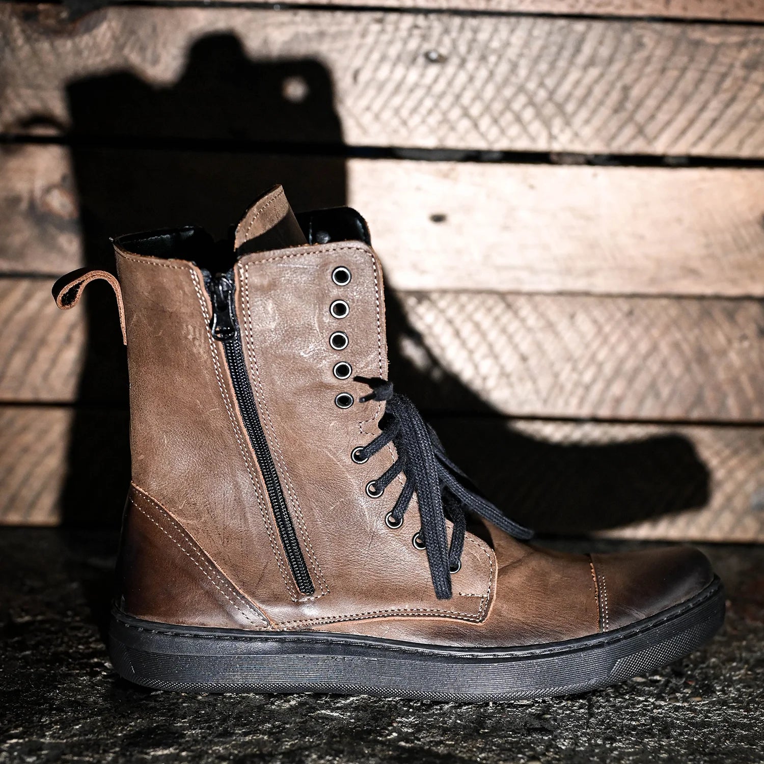 Liam to męskie buty, które łączą surową estetykę z wygodą codziennego użytkowania. Ręcznie wykonane z naturalnej skóry, wyposażone w wysoką cholewkę, czarne sznurowadła i boczny zamek – ten model to idealna równowaga między stylem casualowym a militarnym.